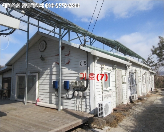 경량철골구조 아스팔트슁글지붕 단층 건물로서,외벽: 비닐사이딩 마감내벽: 벽지, 타일 등 마감창호: 하이샤시임.