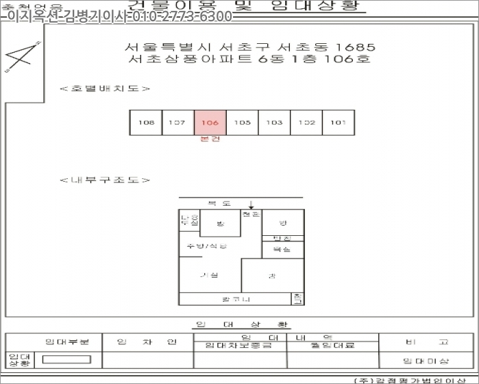 [건물구조] 철근콘크리트조, 슬래브지붕 지하1층/지상15층 건물 내 1층 106호로외벽: 모르타르 위 페인트 마감,내벽: 모르타르 위 페인트 마감 및 일부 벽지도배 마감, 창호: 알루미늄 새시 창호 등 임.