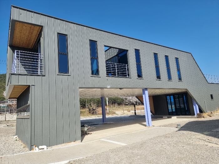 기호(3) : 철근콘크리트구조 (철근)콘크리트 위 징크판넬지붕 단층 건물로서, 외벽 : 석재붙임,징크판넬, 몰탈위페인팅, 통유리마감 등, 내벽 : 몰탈위페인팅, 타일 등, 바닥 : 타일, 세멘노출 등, 창호 : 섀시창호 등임.