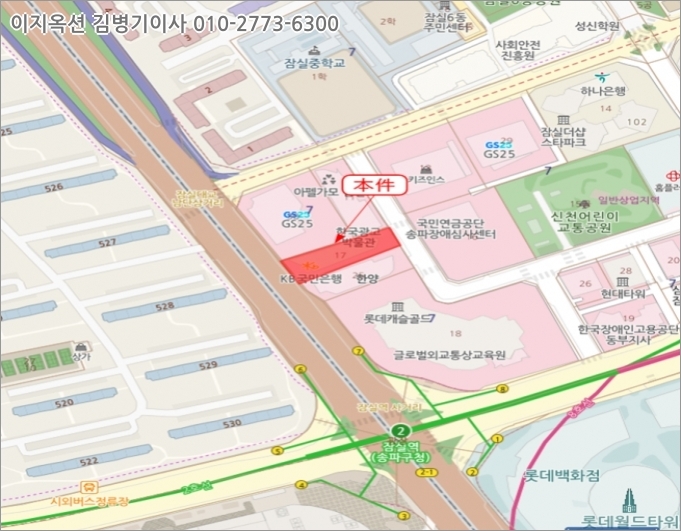 [교통상황] 본건은 차량 출입이 용이하며, 인근에 노선버스 정류장 및 잠실역(지하철 2호선, 8호선)이 소재하여 전반적인 교통상황은 양호함.